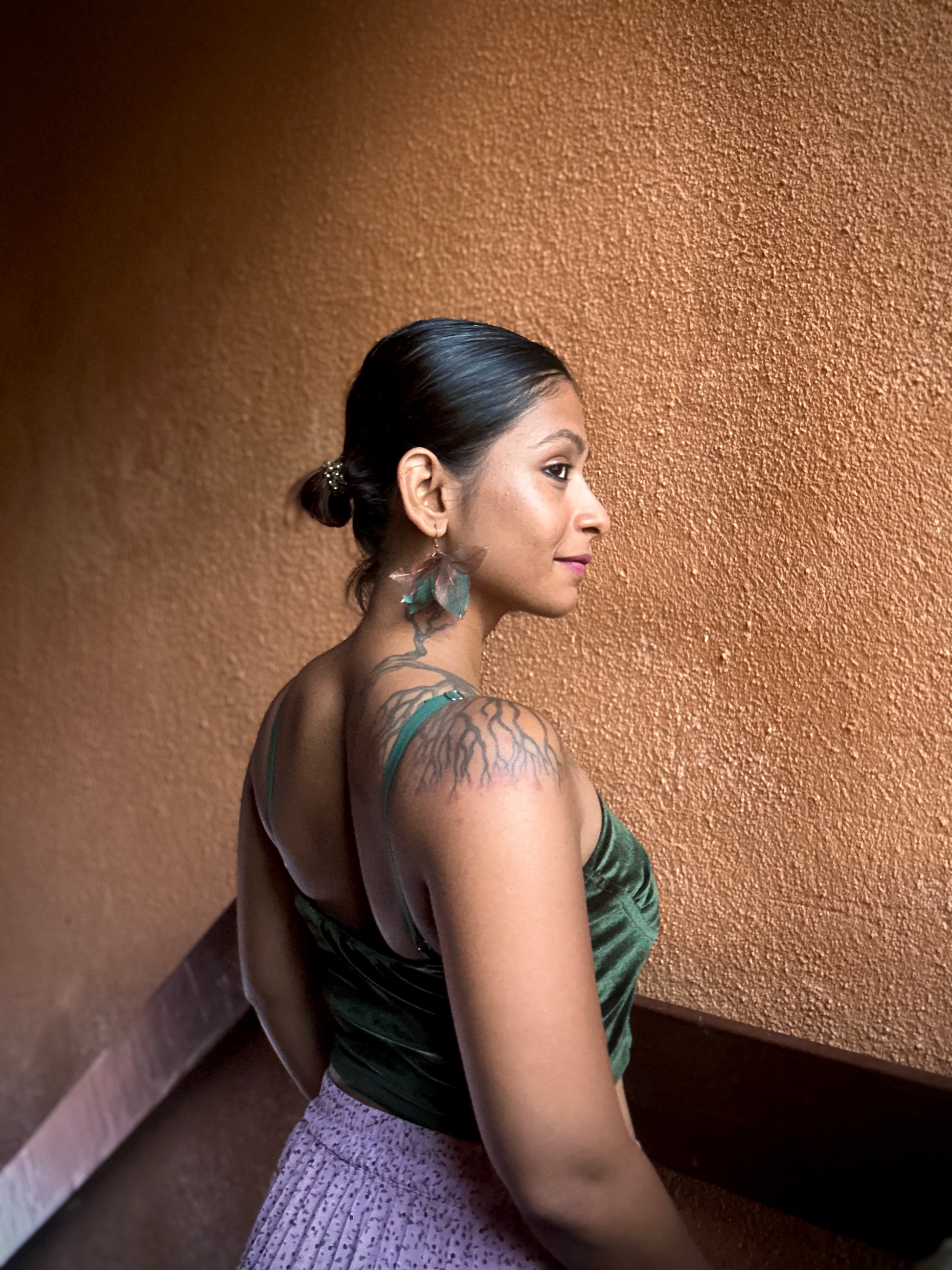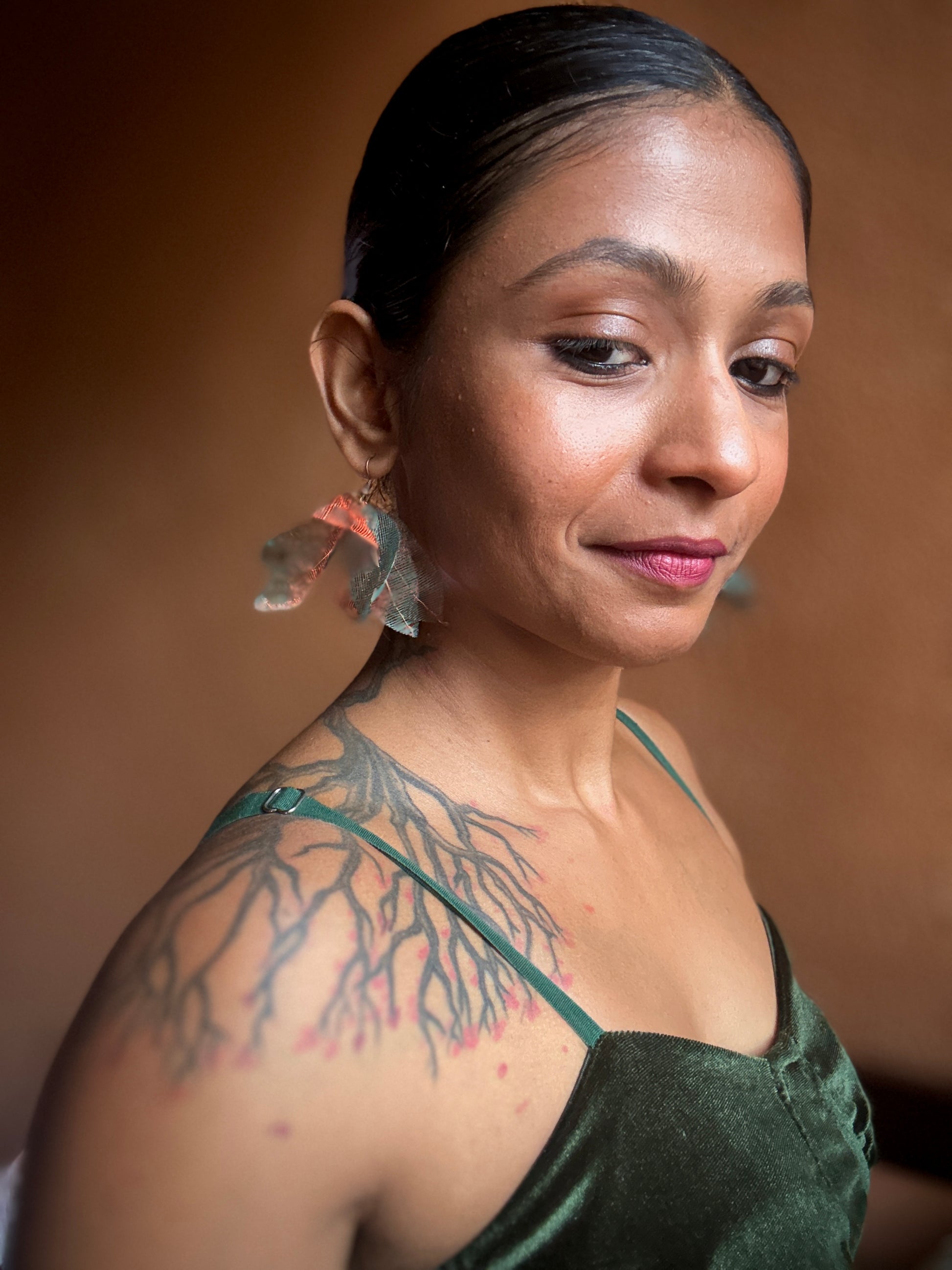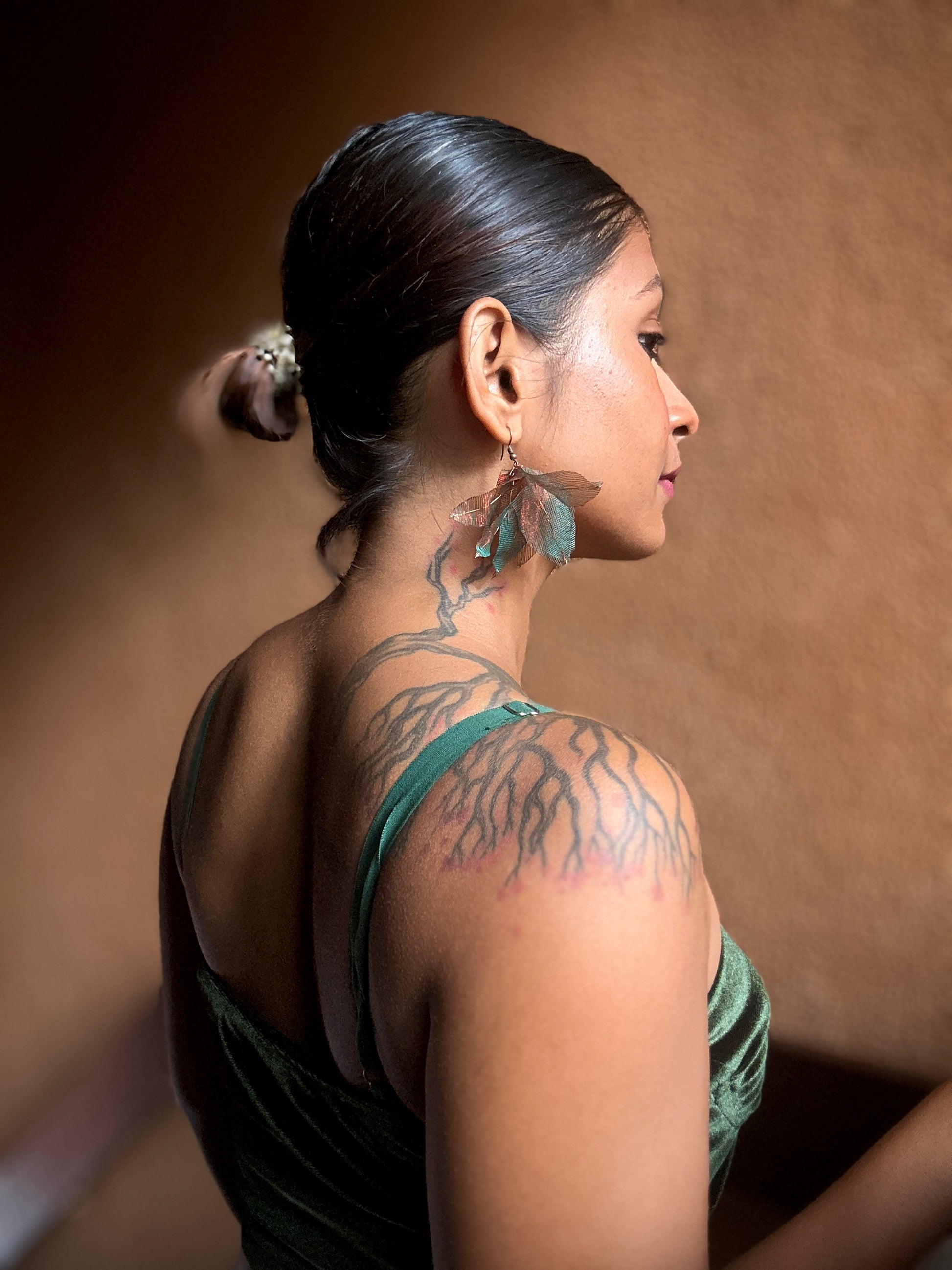 The Luna Earrings arrive understated, and leave unforgettable.Crafted from double-toned teal and copper tissue fabric, each petal is hand-cut, edge-sealed by fire to hold its shape, and brought together with a gleam of copper wire and pure copper hooks. They don’t shout, but they always get noticed. Eccentric , understated, and quietly dramatic.