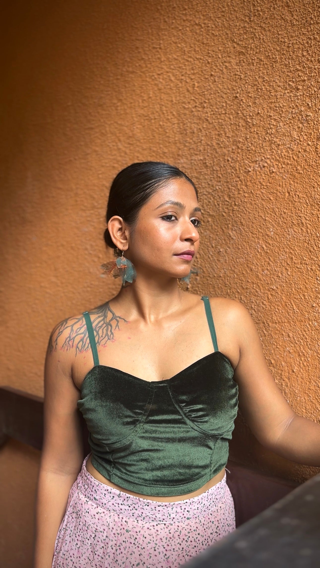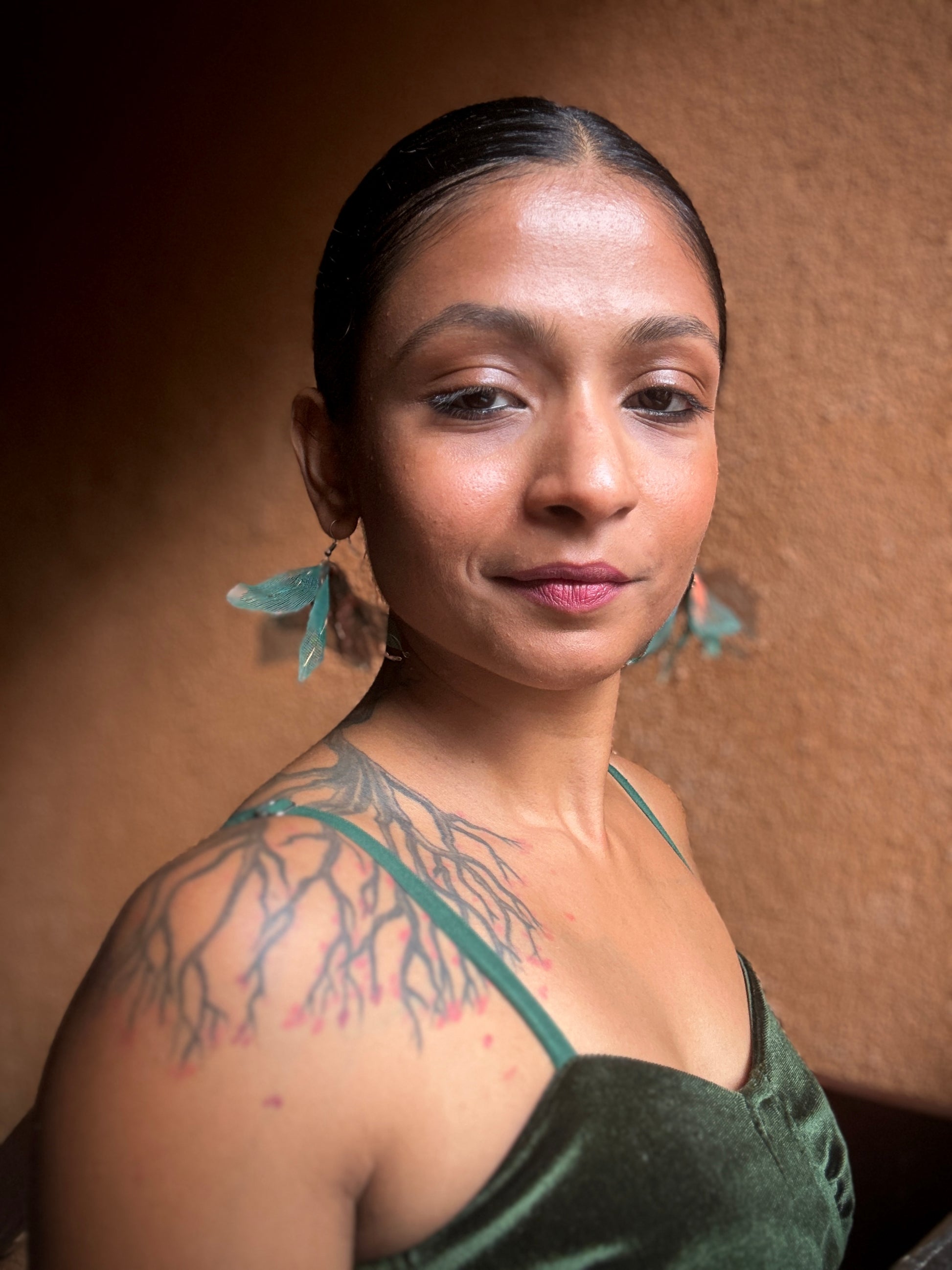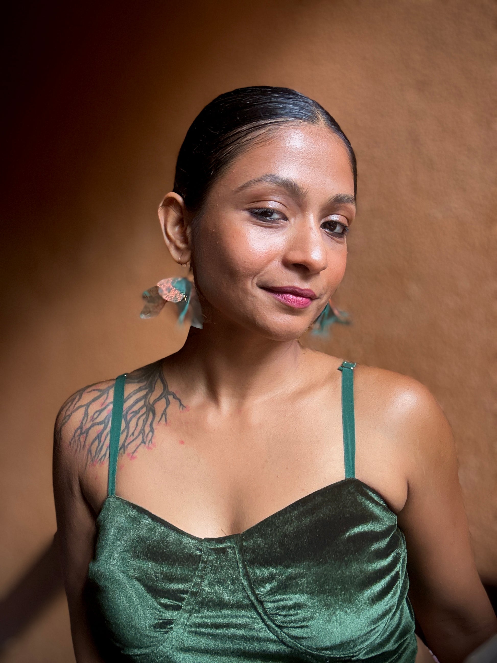 The Luna Earrings arrive understated, and leave unforgettable.Crafted from double-toned teal and copper tissue fabric, each petal is hand-cut, edge-sealed by fire to hold its shape, and brought together with a gleam of copper wire and pure copper hooks. They don’t shout, but they always get noticed. Eccentric , understated, and quietly dramatic.